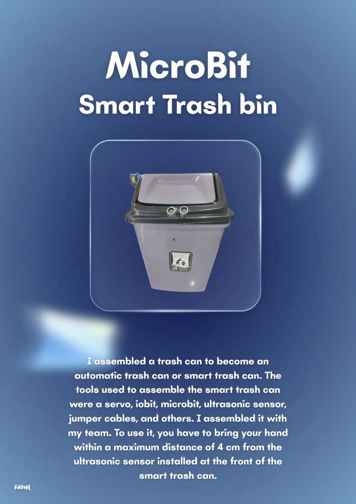 So, in this project in second semester, I assembled a trash can to become an automatic trash can or smart trash can. The tools used to assemble the smart trash can were a servo, iobit, microbit, ultrasonic sensor, jumper cables, and others. I assembled it with my team. To use it, you have to bring your hand within a maximum distance of 4 cm from the ultrasonic sensor installed at the front of the smart trash can. After that, the smart trash can will open for 5 seconds. After placing the trash inside, you must close the smart trash can with your hand as if you were opening it.